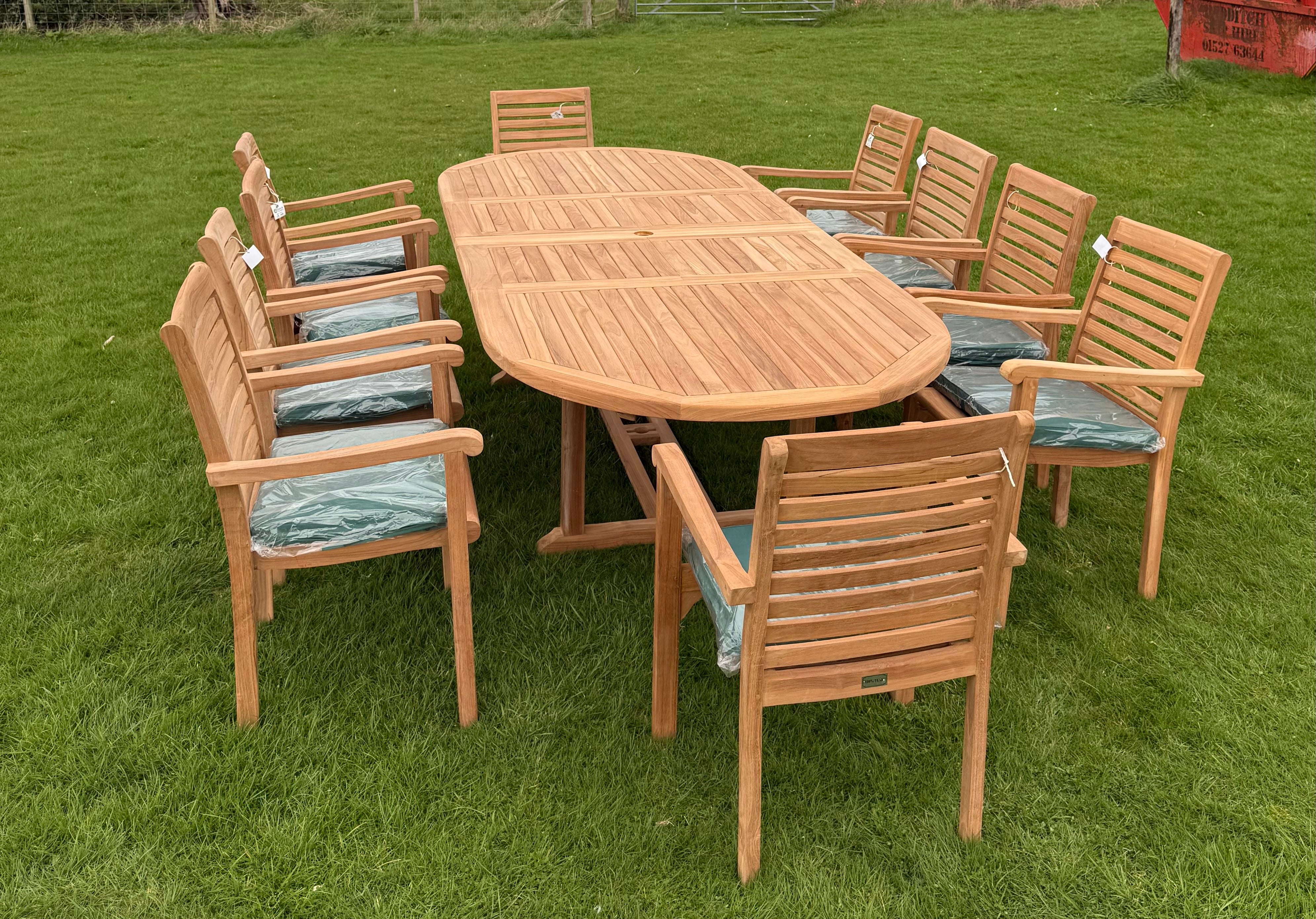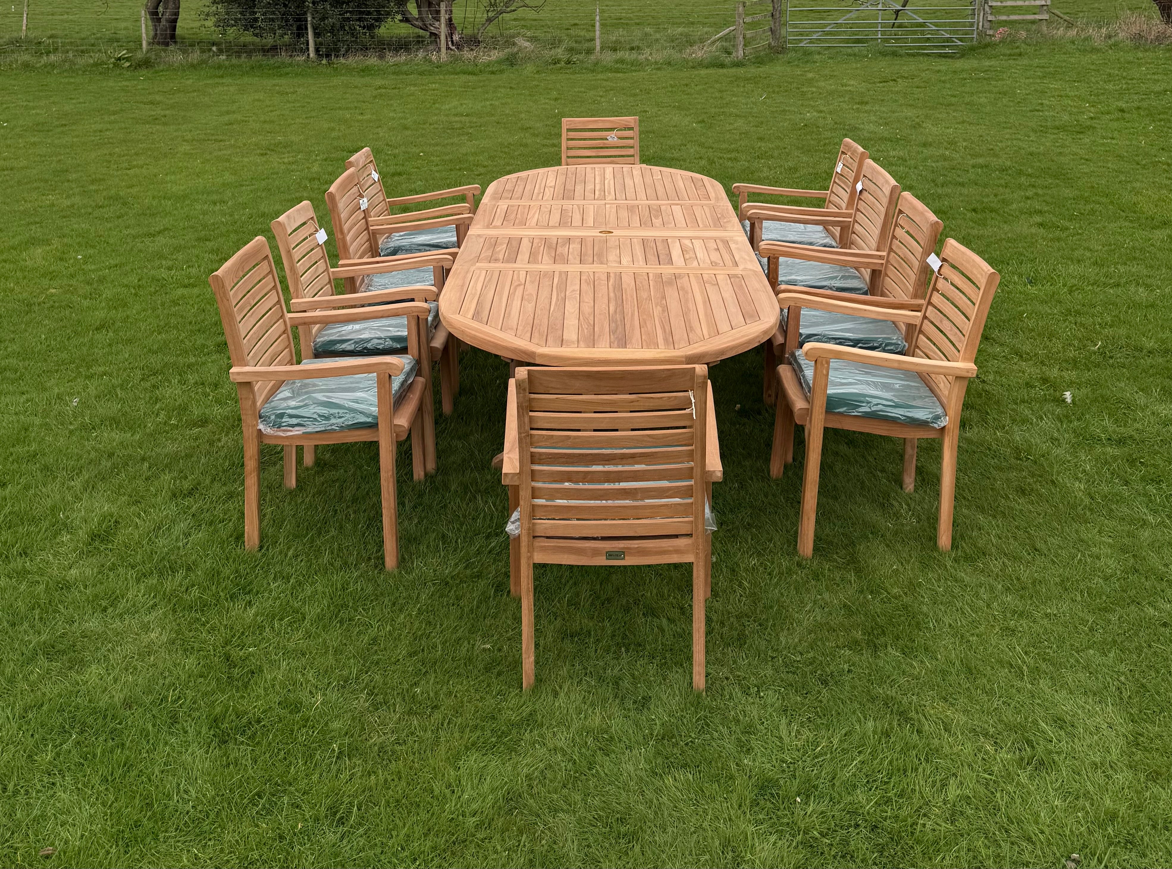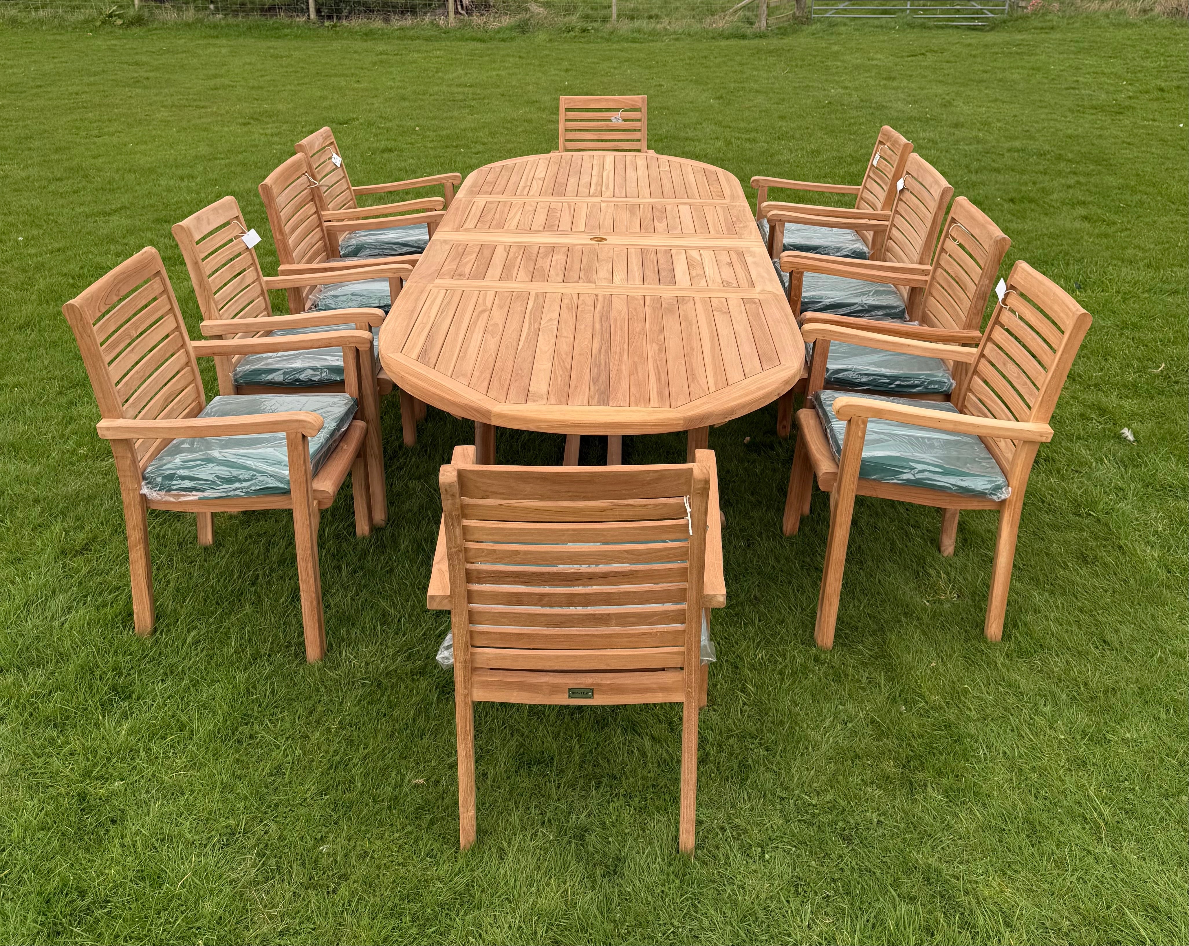 This stylish teak dining set comes with a large deluxe dining table and ten stacking chairs, perfect for outdoor gatherings with family and friends.