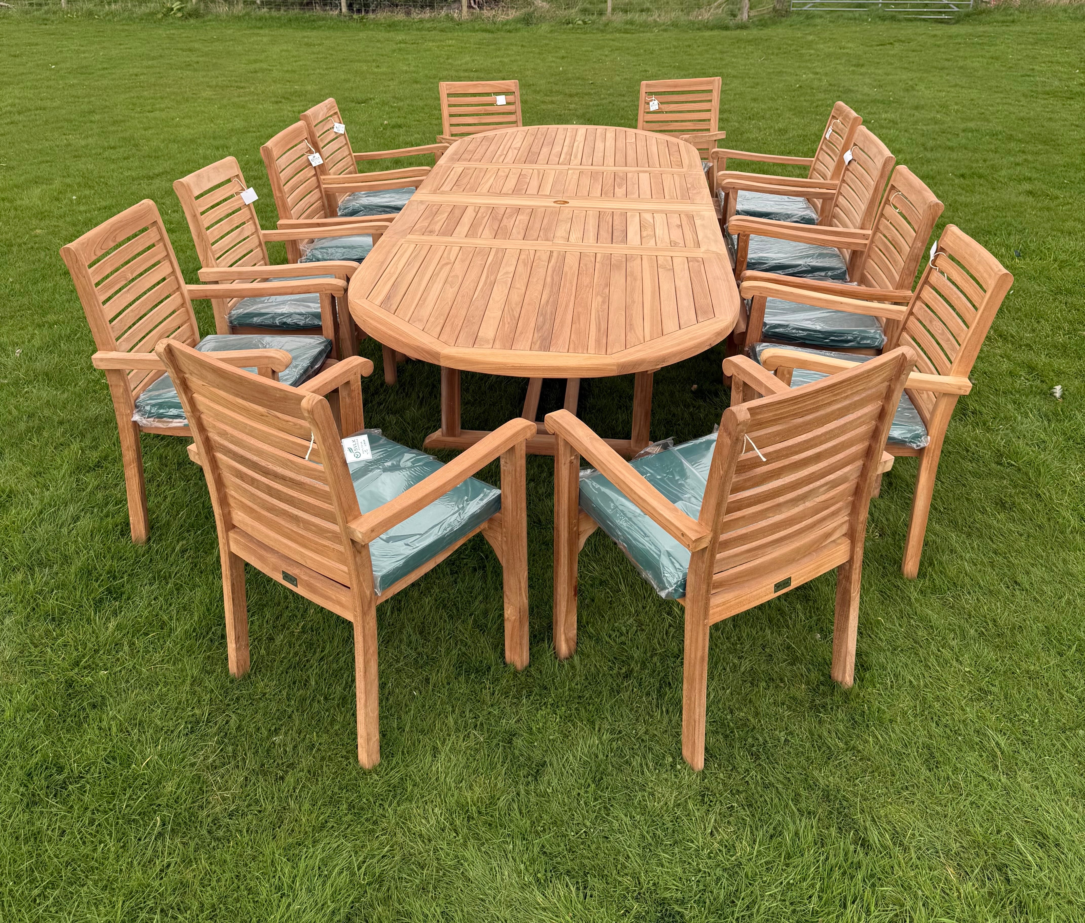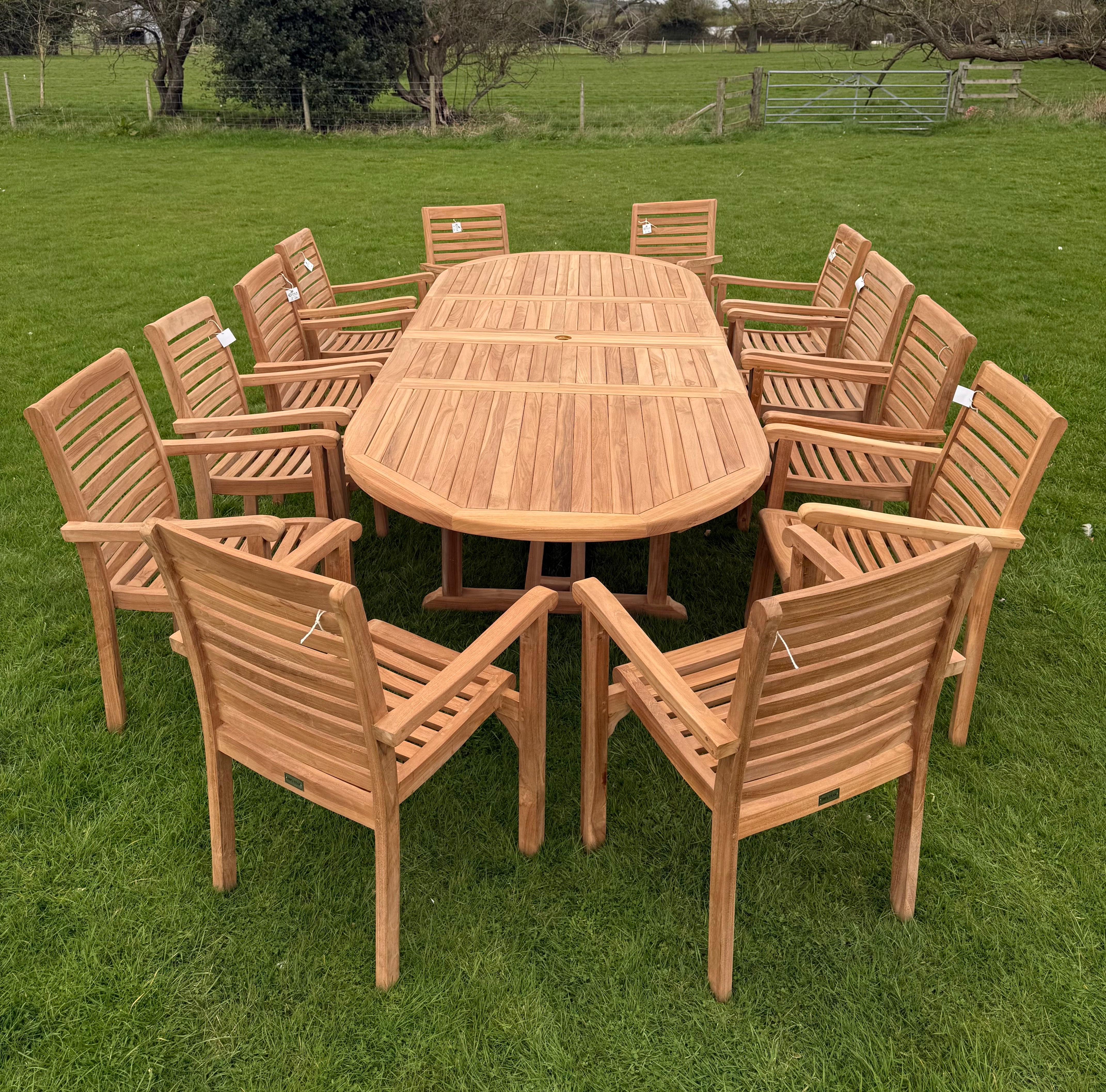 This stylish teak dining set comes with a large deluxe dining table and twelve stacking chairs, perfect for outdoor gatherings with family and friends.