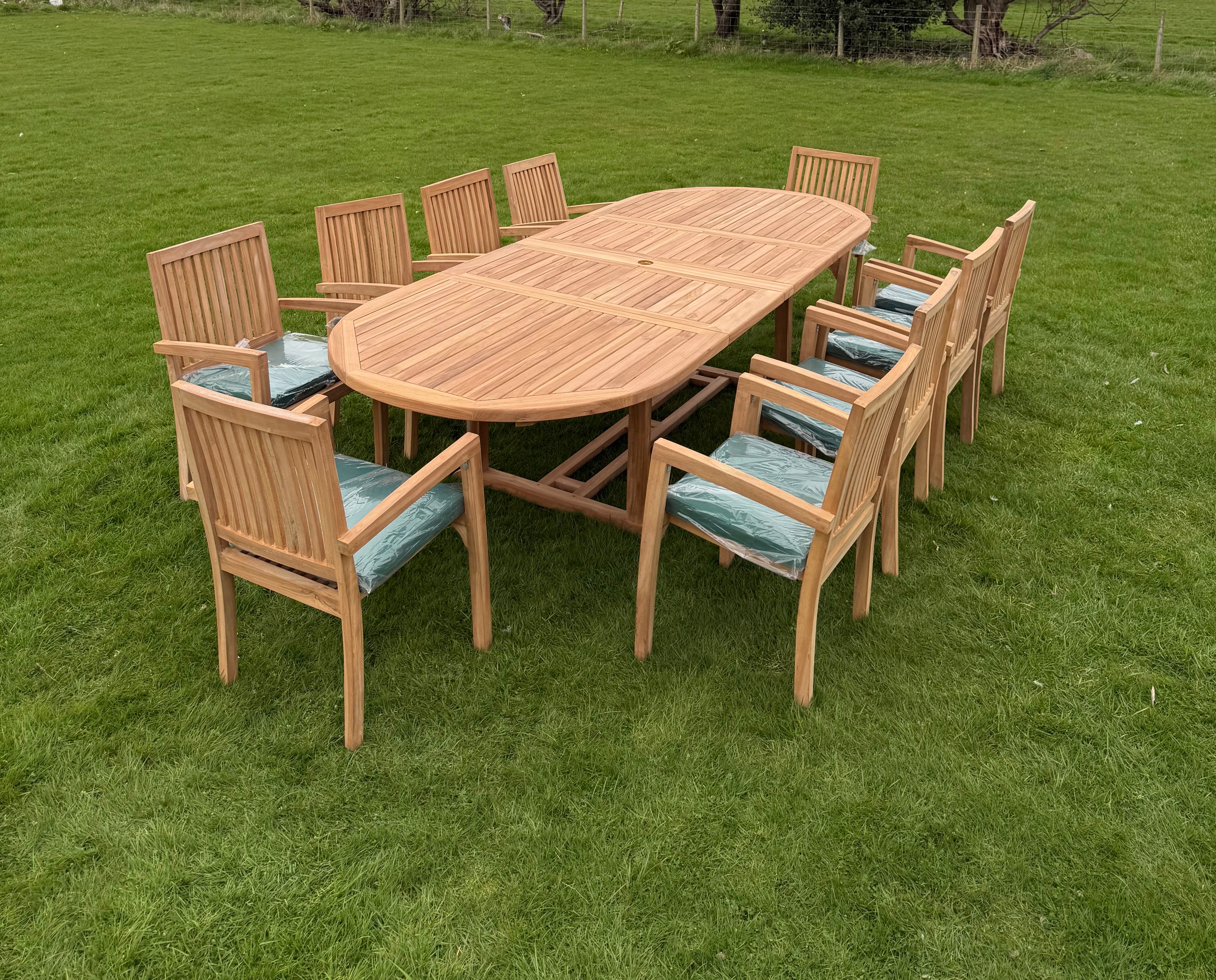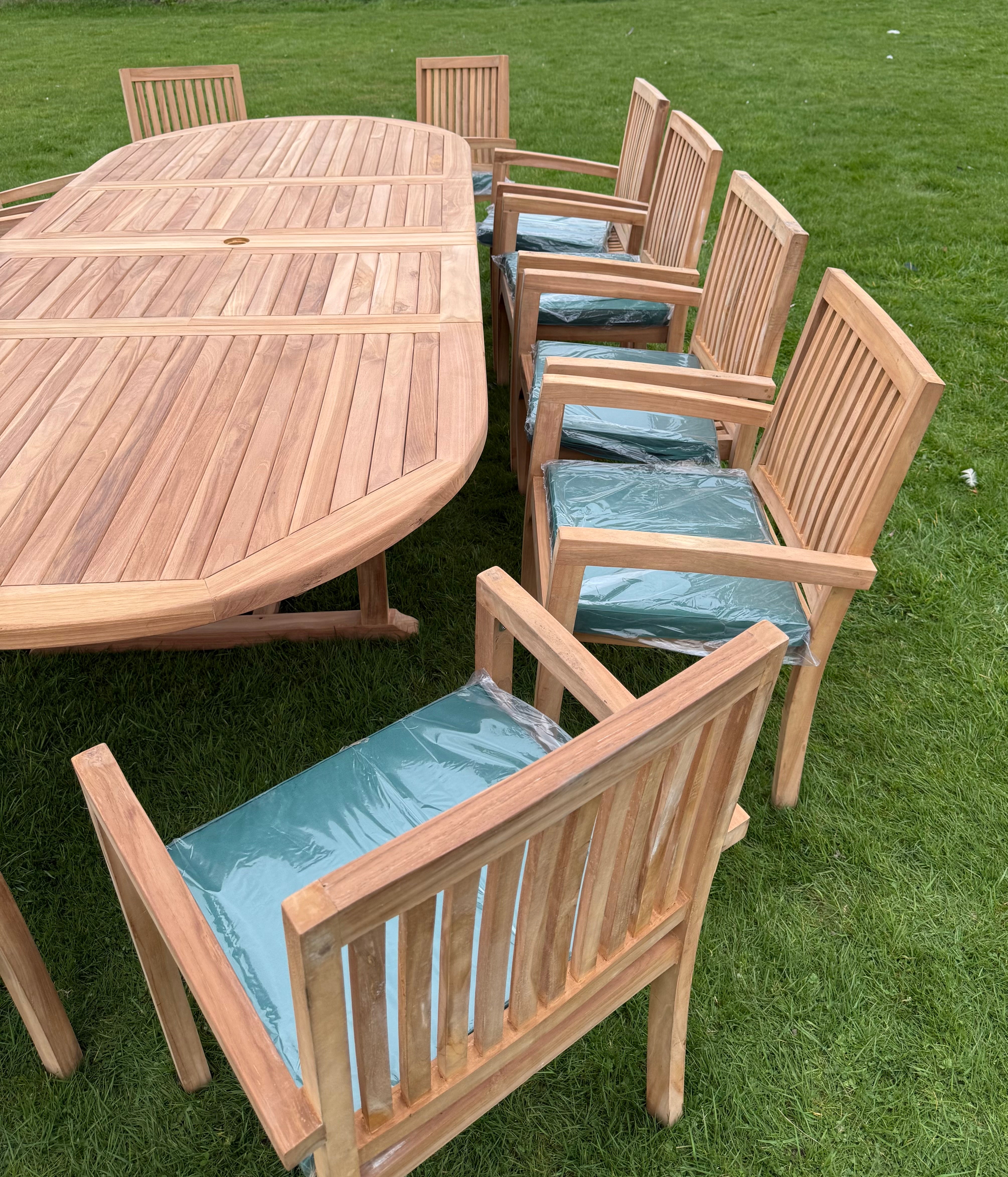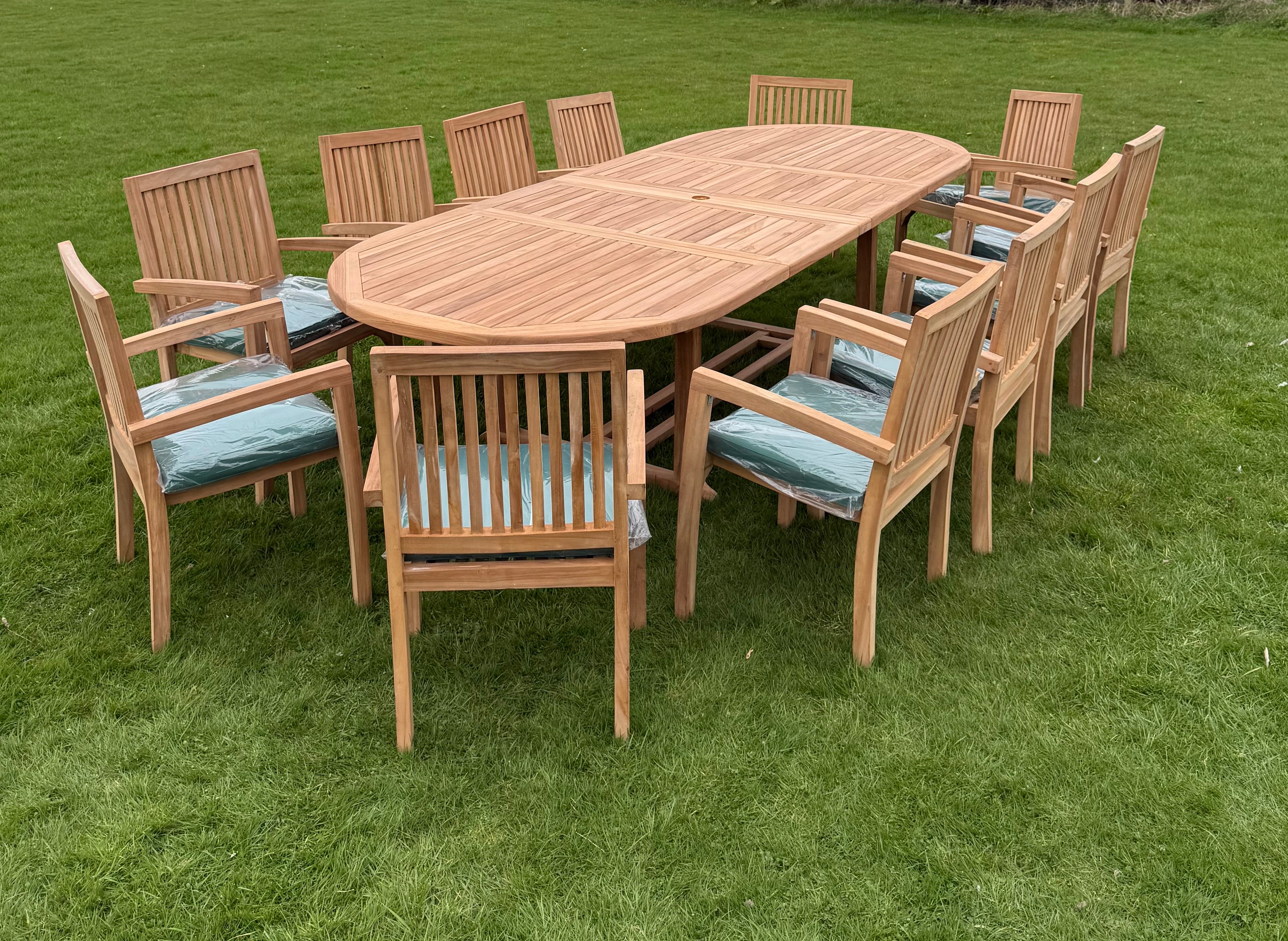 This stylish teak dining set comes with a large deluxe dining table and twelve stacking chairs, perfect for outdoor gatherings with family and friends.