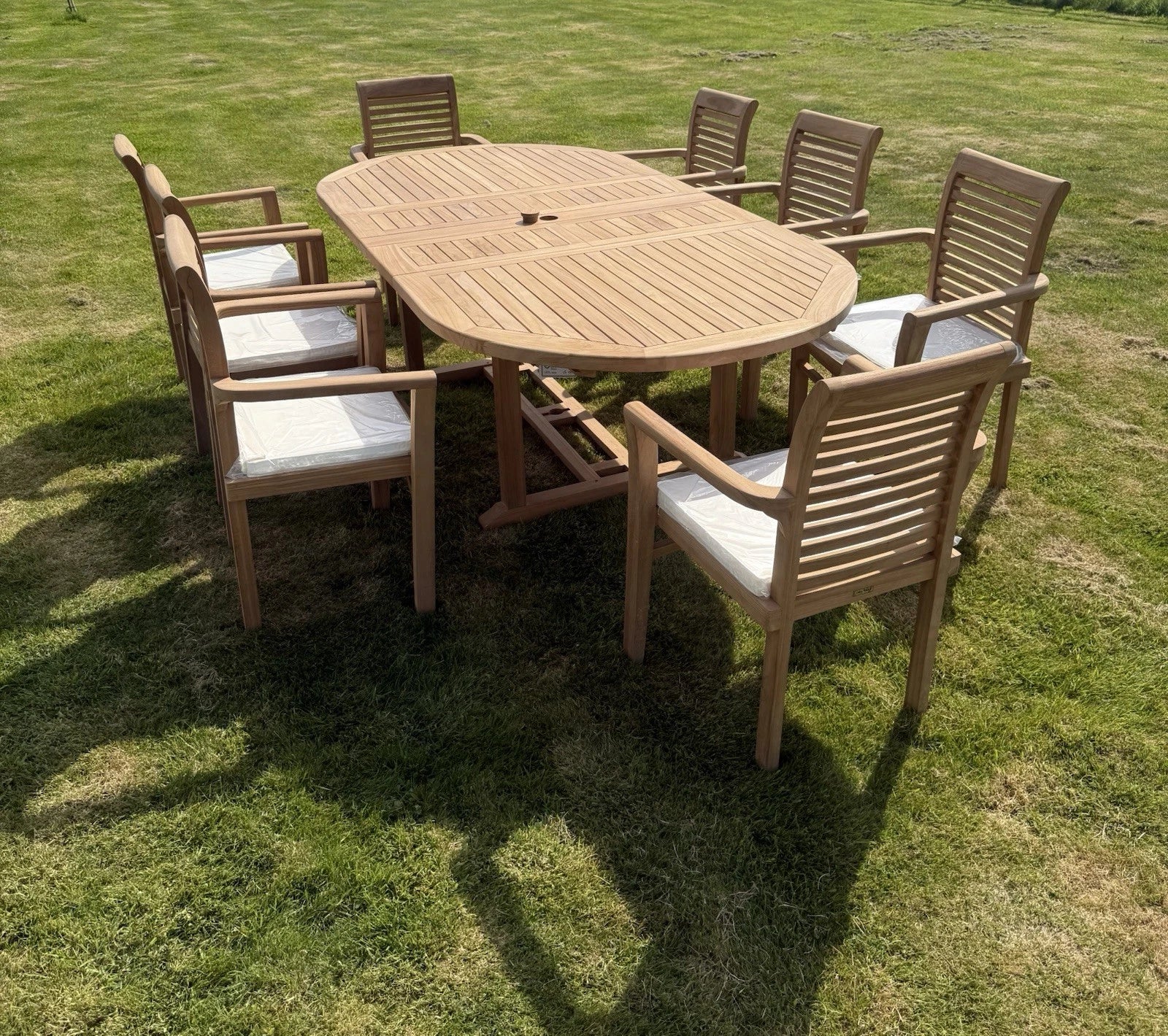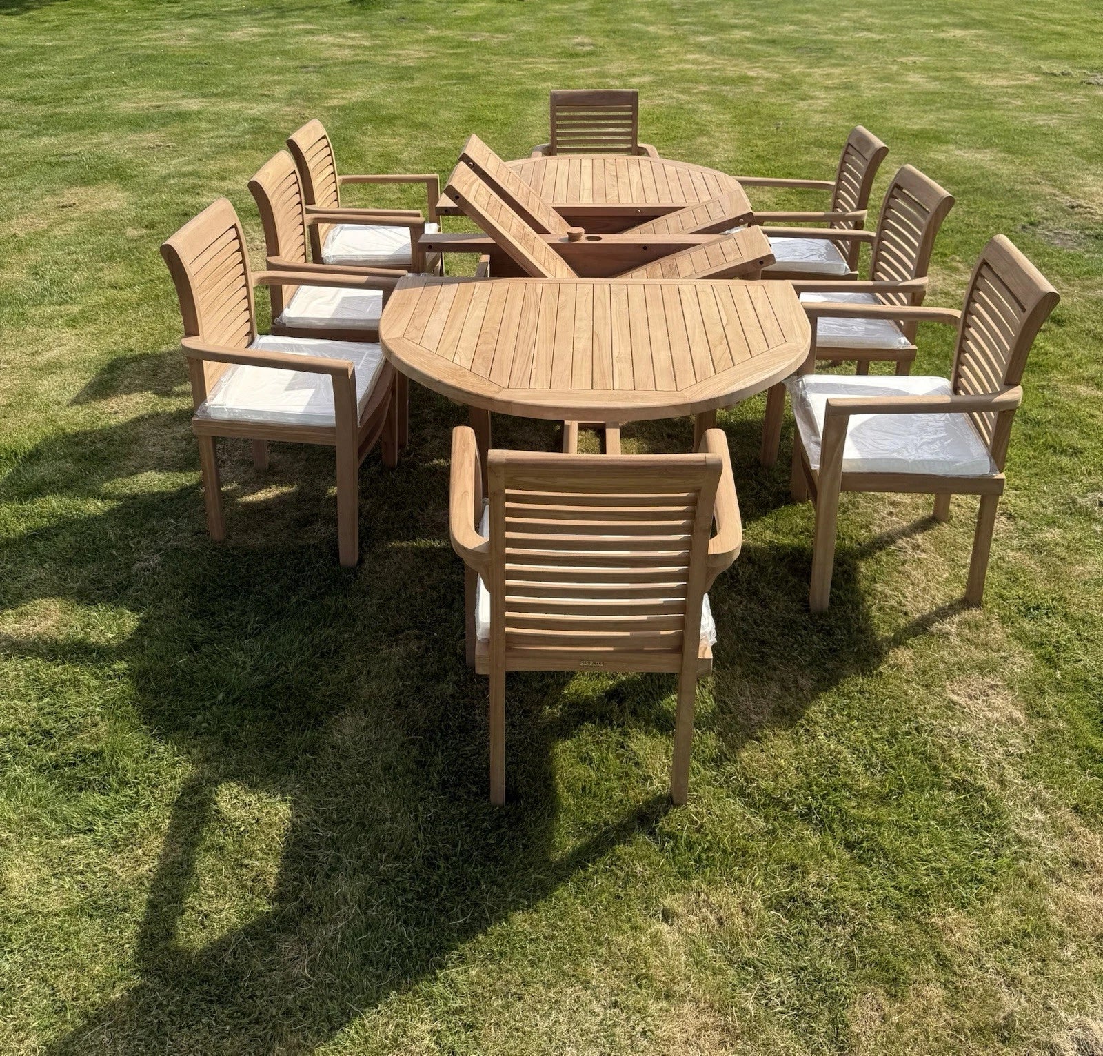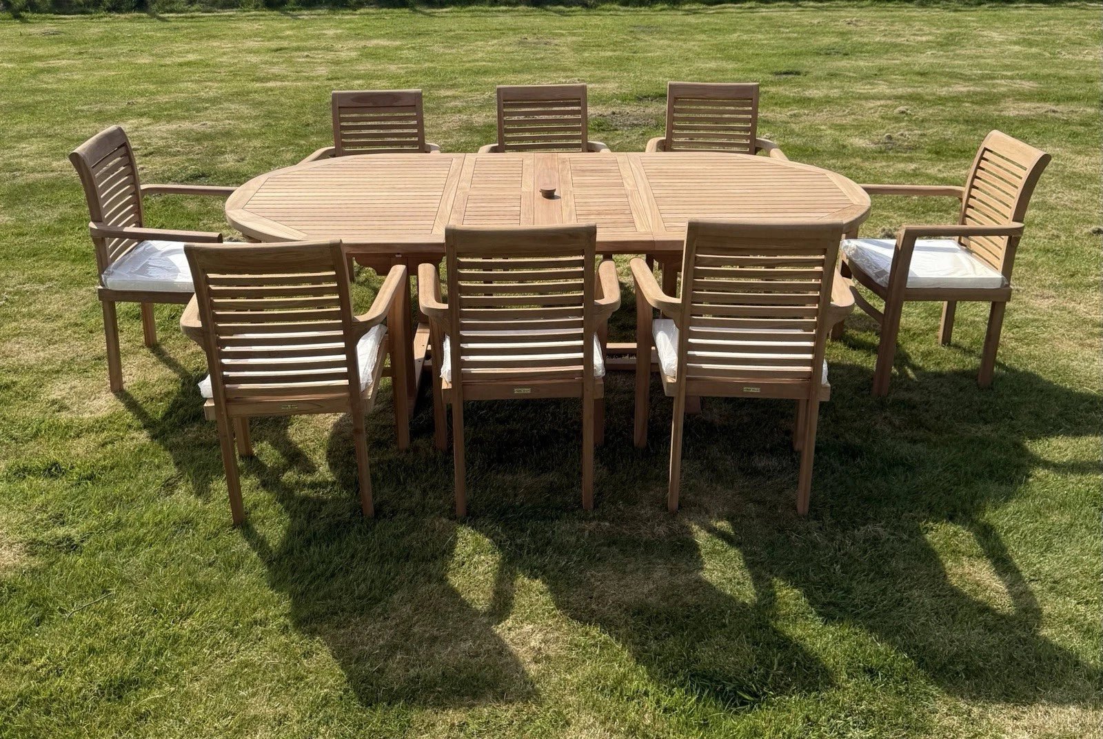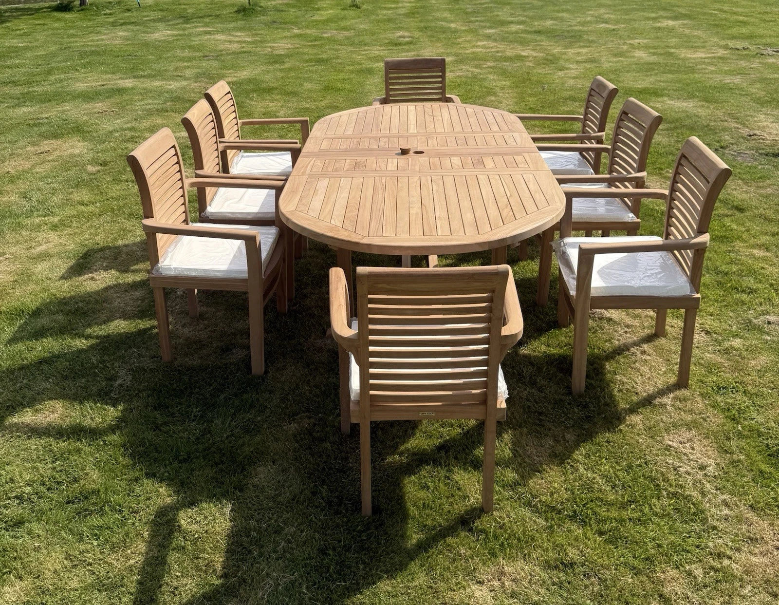 This stylish patio eight seater teak dining set comes with a deluxe 4cm thick table and eight Enclave stacking chairs, perfect for outdoor dining with family and friends.